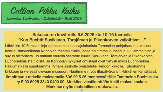 Matkan varrella saamme kuulla Susikkaan, Torajärven ja Pikonkorven Bucht-sukuisista tiloista. Ja Könnölän nykyiset omistajat ovat tietysti myös Bucht-sukua.… — Lue lisää