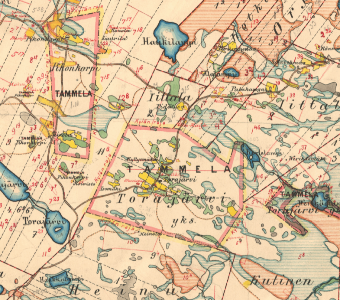 Kun Tammelan kirkolta lähtee Mustialan ja Susikkaan kylien kautta kulkemaan Hämeenlinnaa kohti, joutuu Lautaportaassa Lopen—Urjalan väliselle valtatielle ja samalla Kalvolan pitäjän alueelle. Tuntuu siltä kuin Tammelan laaja pitäjä olisi jäänyt taakse kokonaisuudessaan. Niin ei kuitenkaan ole, sillä n. kolmen kilometrin päässä on Kalvolan maiden keskellä vielä kaksi Tammelan pitäjän kylää: Torajärvi ja Pikonkorpi. Edellisessä on kaksi taloa: Puhtila ja Heikkilä sekä Puhtilasta aikanaan syytinkimaaksi erotettu. nyt jo itsenäistynyt, Isomäki-niminen lohkotila…
