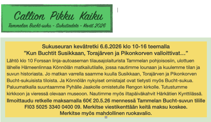 Ilmoittaudu retkelle maksamalla 60 € 20.5.26 mennessä Tammelan Bucht-suvun tilille FI03 5025 3340 0400 09. Merkitse viestikenttään keitä maksu koskee. Merkitse myös mahdollinen ruokavalio.